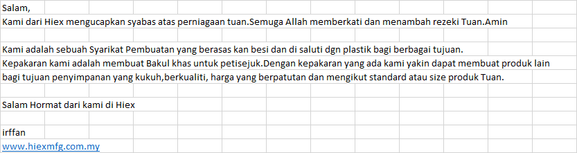 Kami dari Hiex mengucapkan syabas atas perniagaan tuan.Semuga Allah memberkati dan menambah rezeki Tuan.Amin