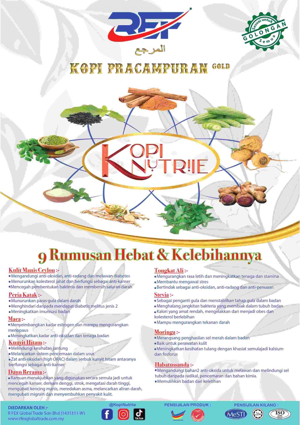 1. Pracampuran Kopi & Teh Nutriie – 9 dalam 1 mengunakan Stevia dan semua bahan2 organik yang telah mendapat Sijil Halal & HCL (Pilihan Terbaik). Ianya baik untuk semua golongan masyarakat yang menikmati Kopi dengan krimer tanpa tenusu dengan Stevia (manis semulajadi dengan 0 kalori) dan 11 bahan yang baik untuk memulihkan kesihatan. Bahan-bahan semulajadi adalah: Habbatussauda, Moringa, Peria Katak, Kayu Manis Ceylon, Stevia, Tongkat Ali, Maca, Daun Rerama dan Kunyit Hitam.